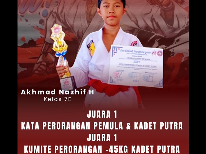 Juara 1 lomba Karate Juara 1 Kata Perorangan Putra, dan jura 1 Mumite Perorangan 45 Kadet Putra Kabupaten SItubondo tahun 2025